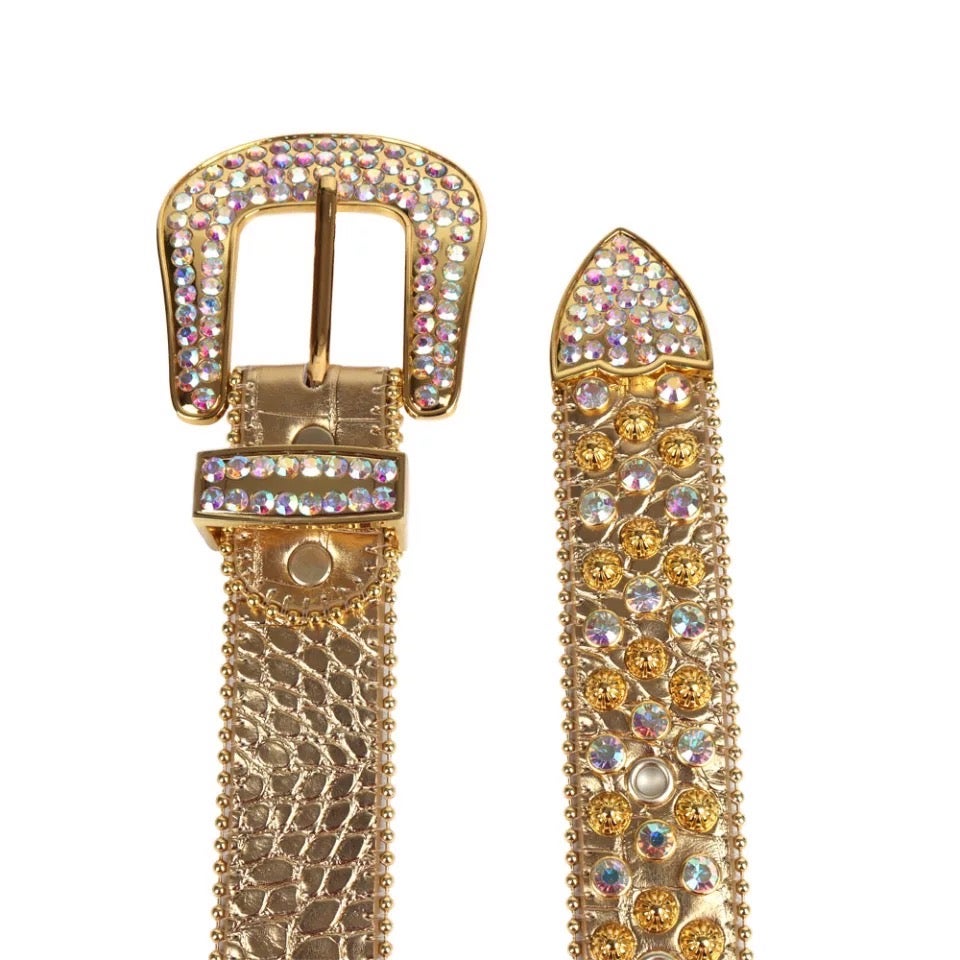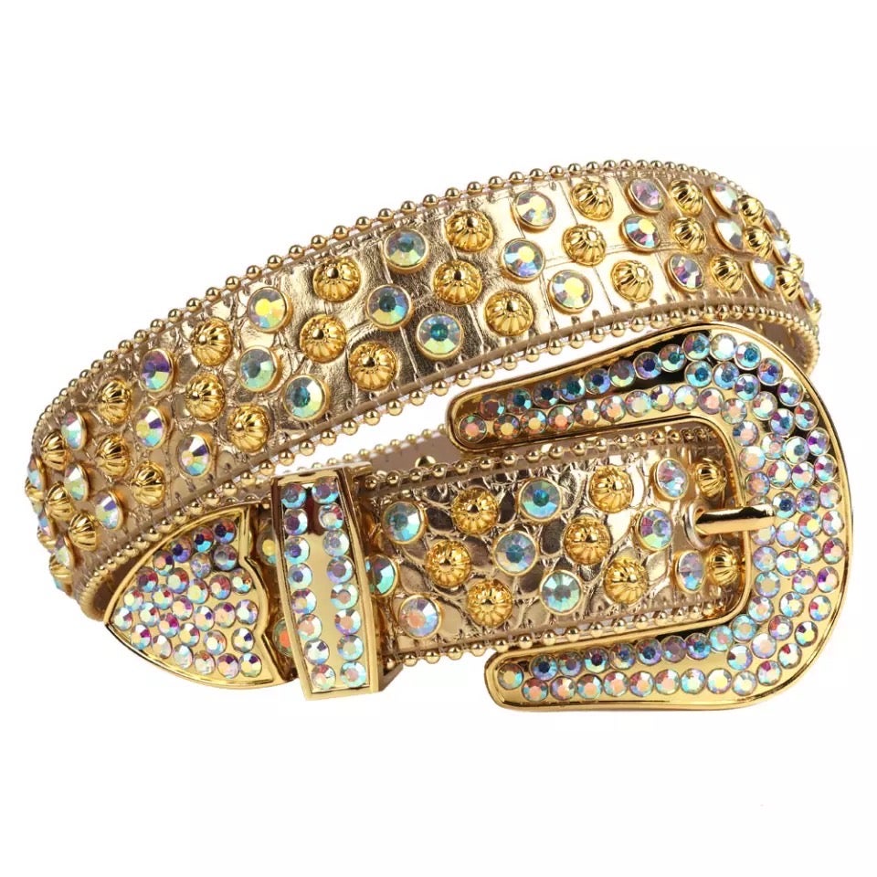 Introducing our studded Golden Treasure infinity 2 Rhinestone Belt, crafted with sparkling rhinestones and genuine leather for a touch of elegance. Available in five sizes, it adds instant flair to any outfit.