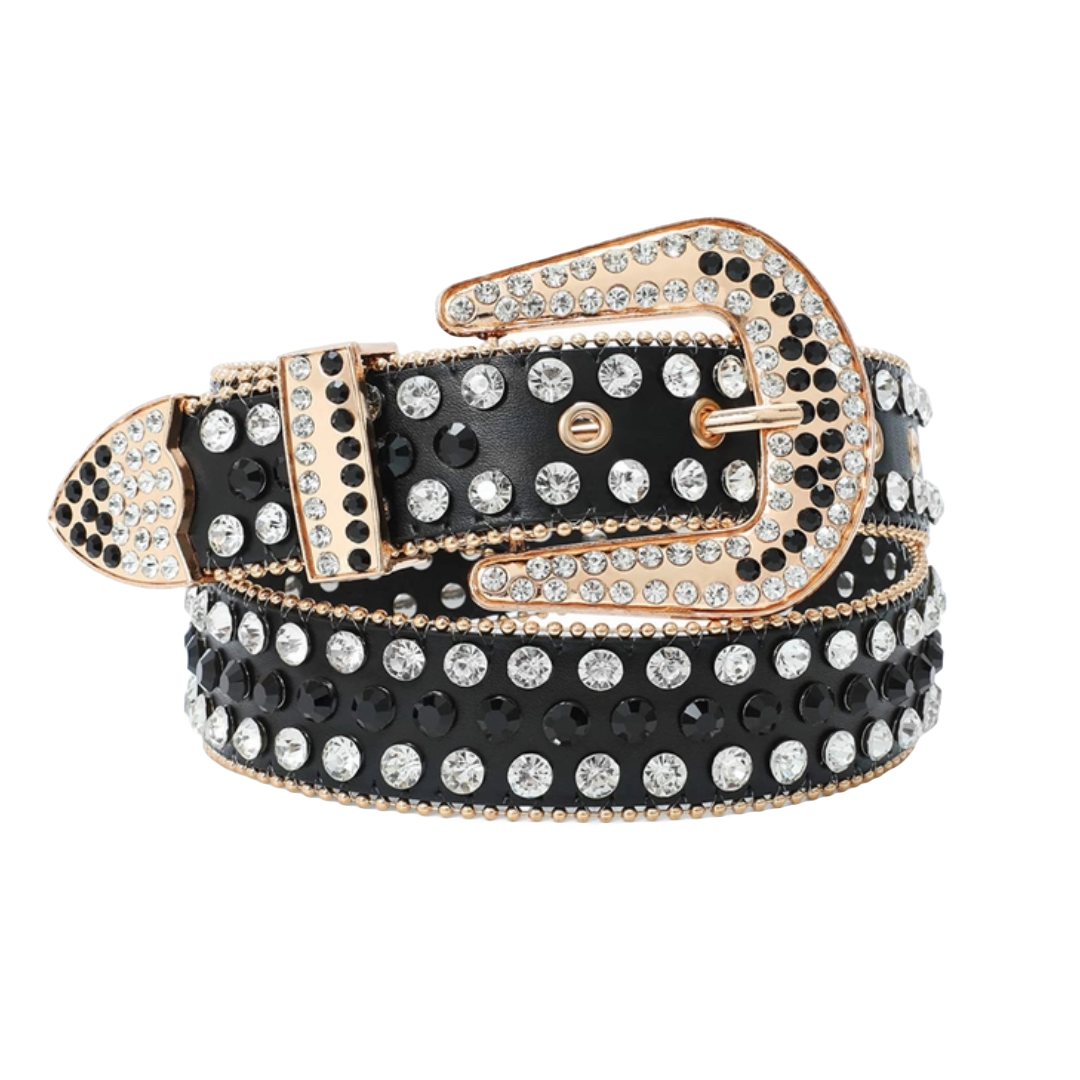 Black and Gold infinity 2 Rhinestone Belt black and Gold with silver accents Made with Rhinestones and genuine leather Sparkles when light hits the belt. Comes in 5 different sizes **Fastest shipping time Takes 7-10 days to Arrive** (This is not a B.B. Simon Belt it is an Infinity belt produced by The B.B. Society.)